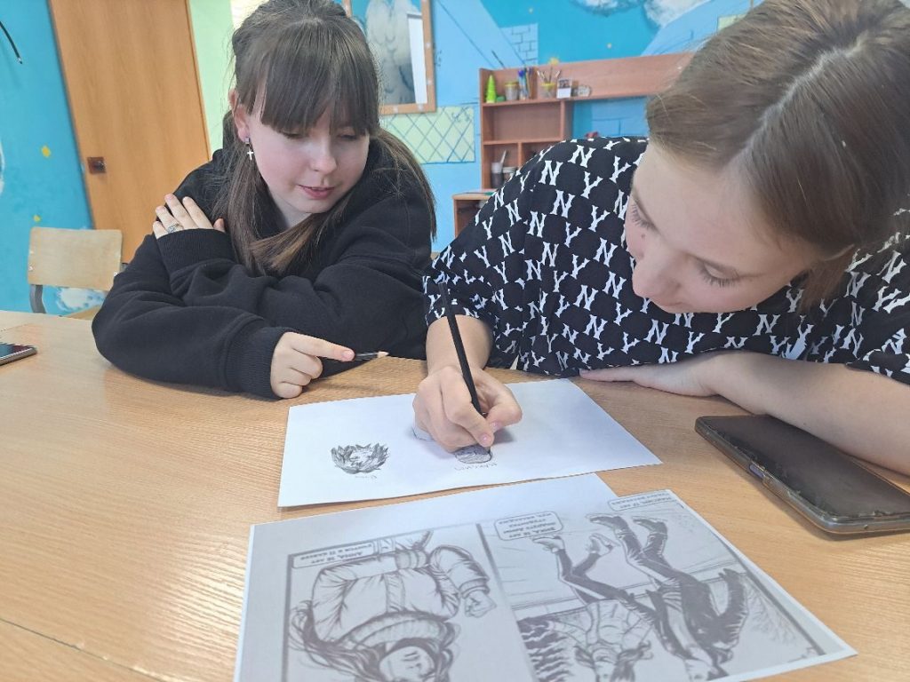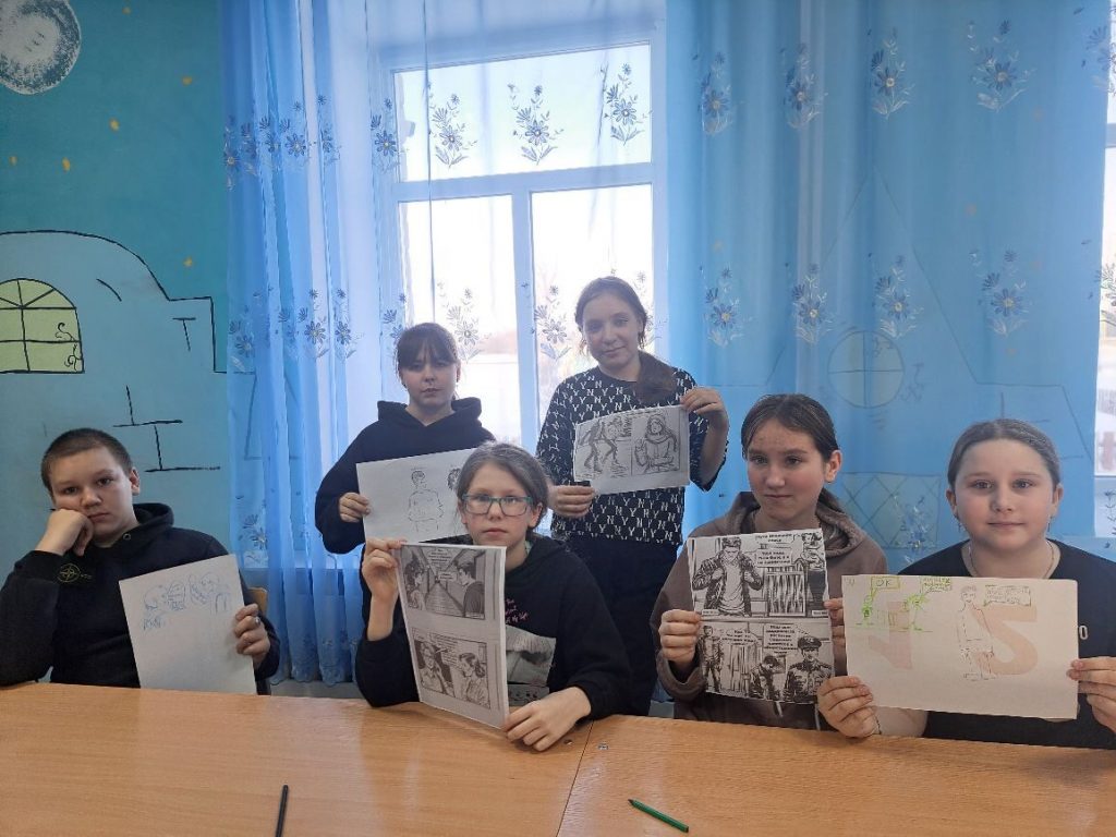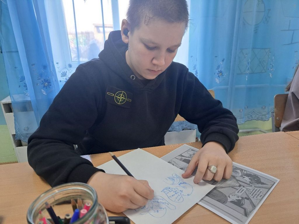 Подростки обсуждали развитие истории и рисовали иллюстрацию с комментариями (мысли, диалоги, реплики). Работая в группах, обсуждали возможную цепь событий с главным персонажем, которая приводит его к заданной развязке и создавали иллюстрации с соблюдением правил.